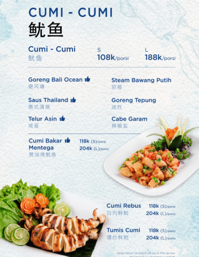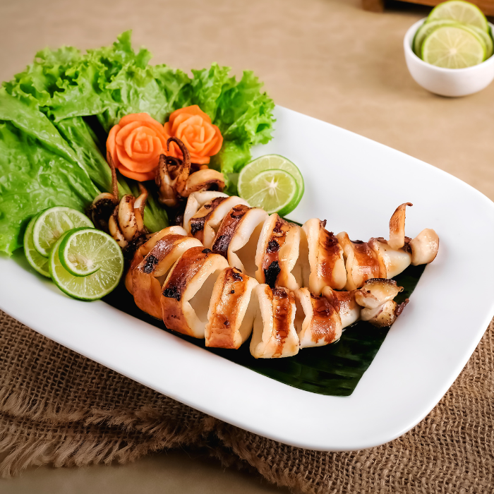 Cumi-cumi pilihan terbaik disajikan dengan aroma smokey yang dihasilkan dari perpaduan bumbu bakar khas Bali Ocean dan Mentega.