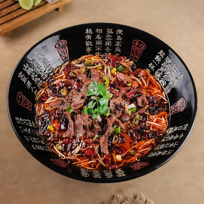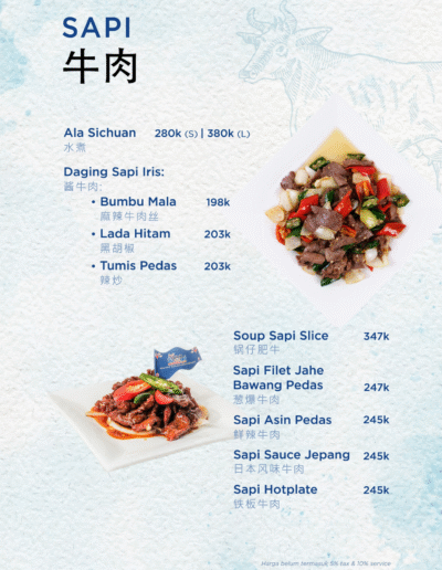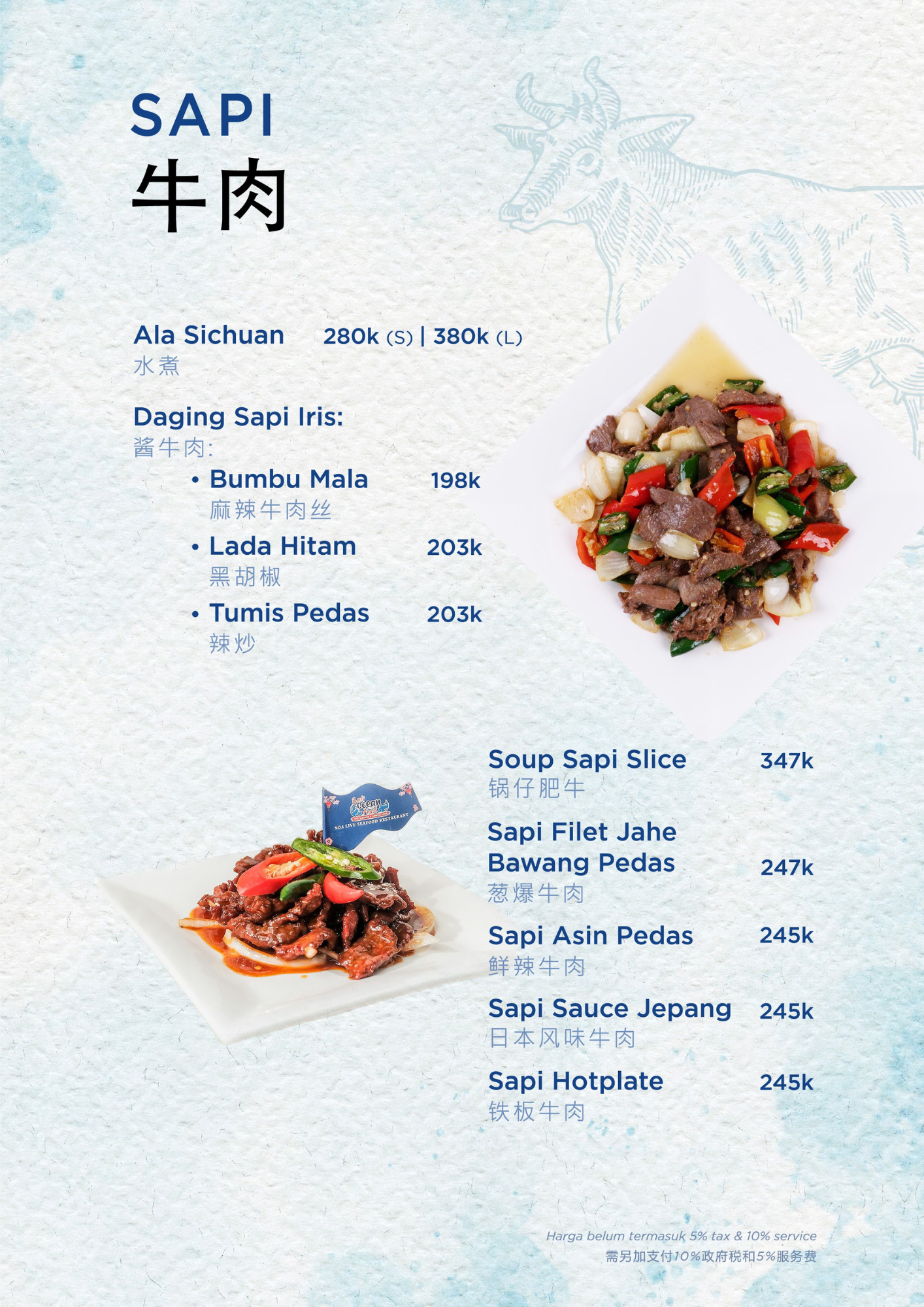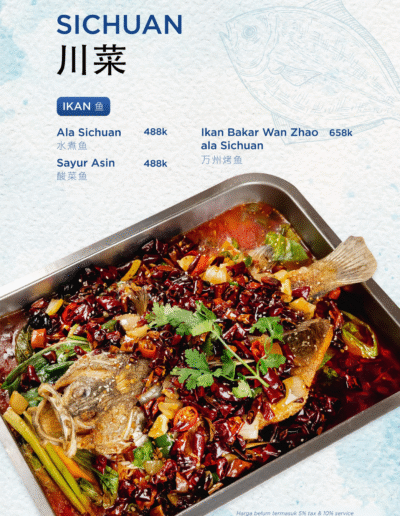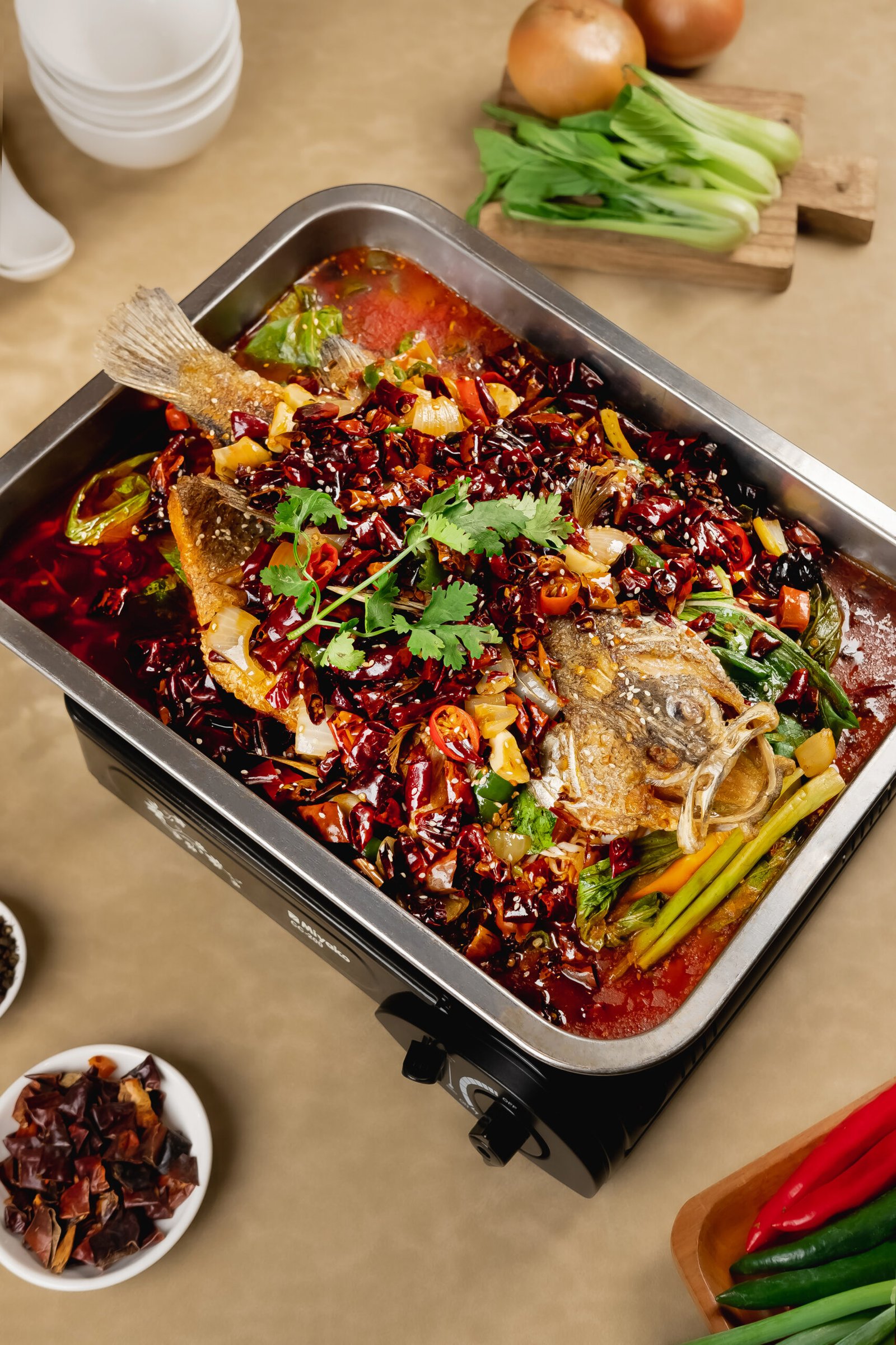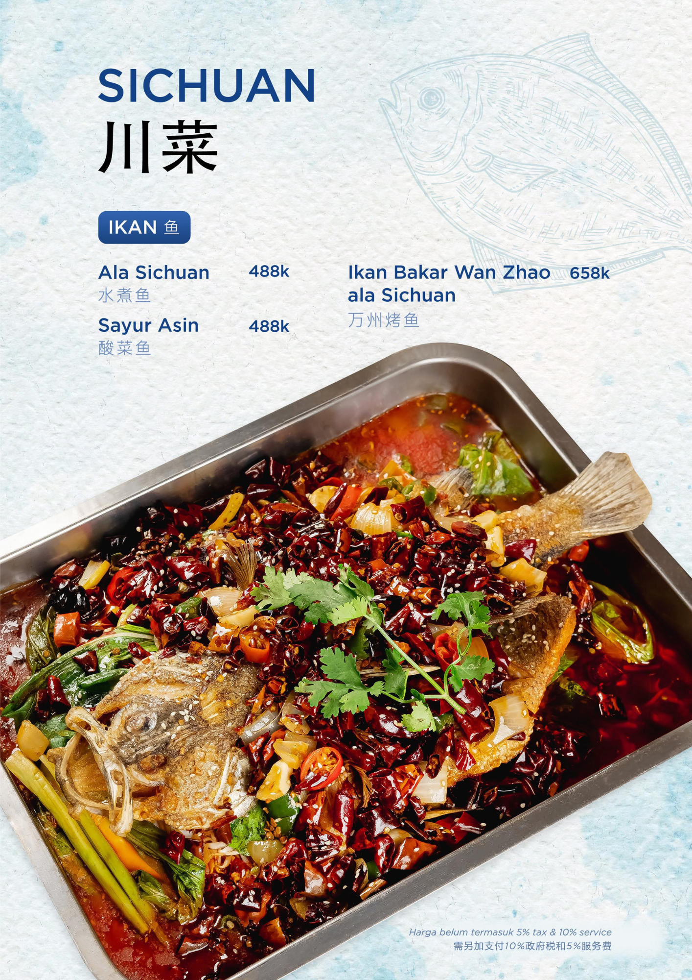 Ikan utuh disajikan diatas kompor dengan kuah mala ala sezhuan. Isian topping berbagai macam sayuran, jamur, kulit tahu dan kembang tahu.