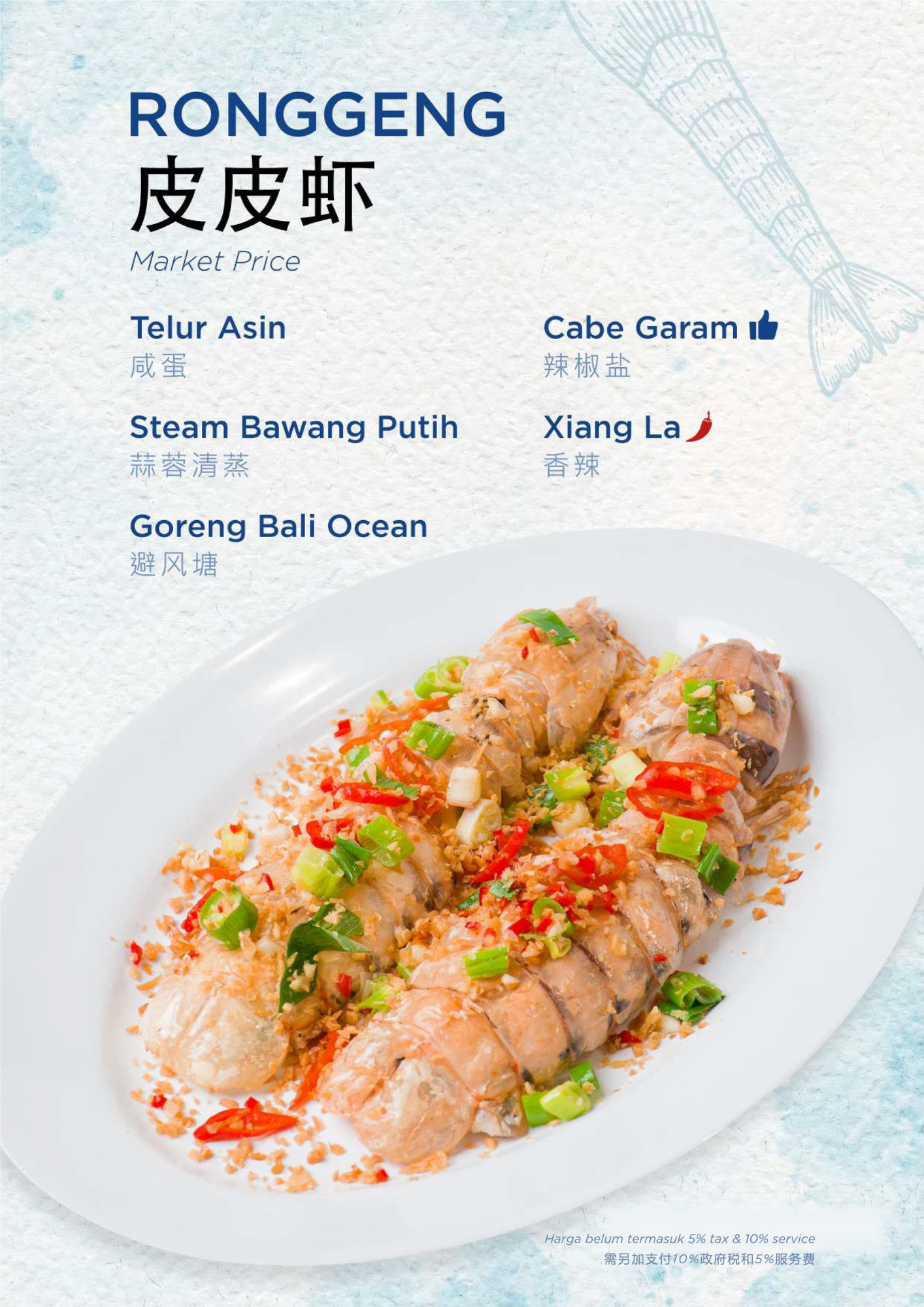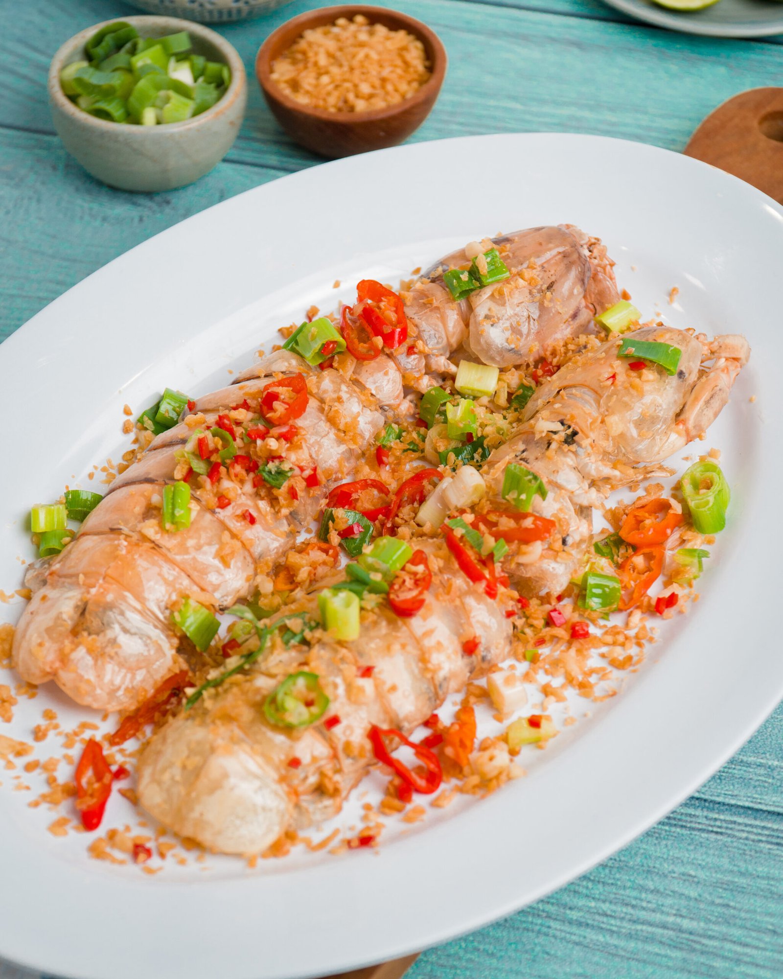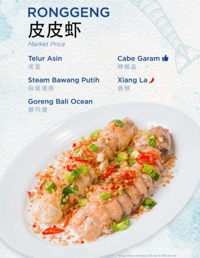 Udang goreng ronggeng disajikan dengan tumisan daun bawang, bawang putih dan potongan cabe ditaburi bumbu khas Bali Ocean.