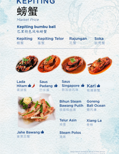 Bali Ocean Feast menyajikan hidangan live seafood dimana pengunjung yang datang dapat memilih berbagai seafood hidup, langsung tangkap lalu santap.