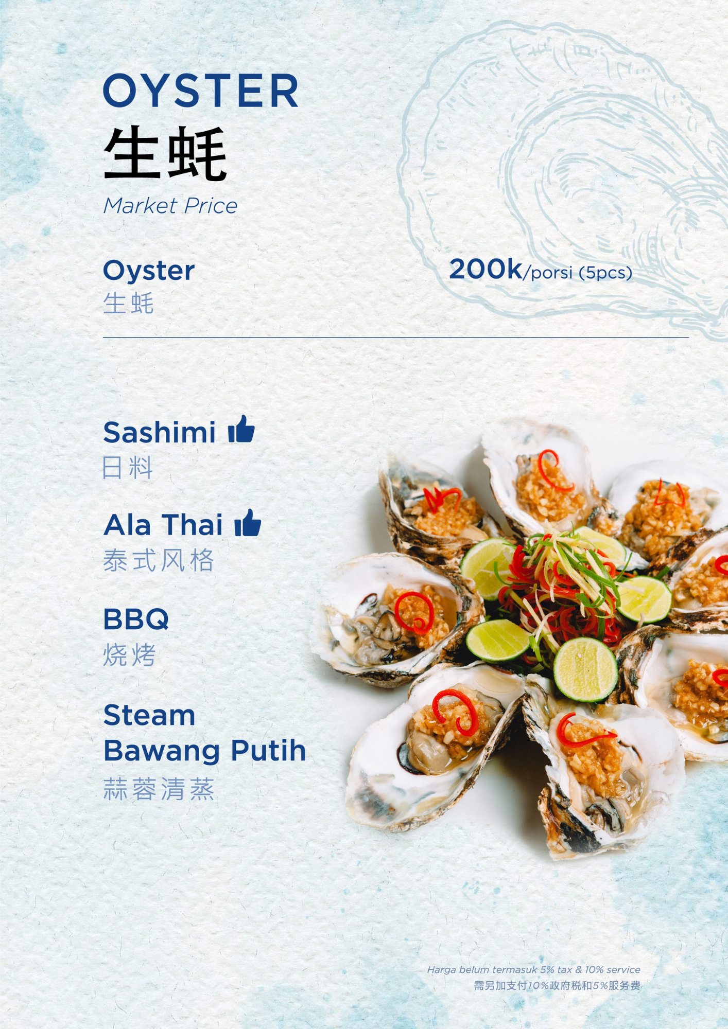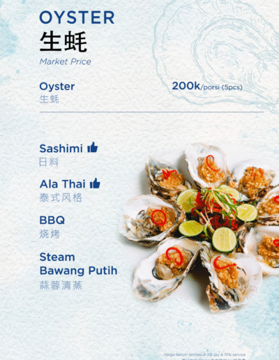 Oyster pilihan terbaik dari lautan Indonesia disajikan khusus dengan wasabi, ala thai, baked with cheese atau bisa juga disajikan dengan cara steam bawang putih.